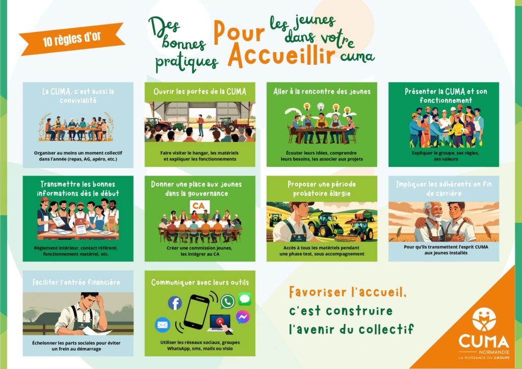 Afin d’avoir un support pratique pour favoriser l’attractivité de la cuma, faciliter une nouvelle adhésion et donner envie au nouvel adhérent de s’investir dans la cuma, nous vous proposons les bonne spratiques suivantes.