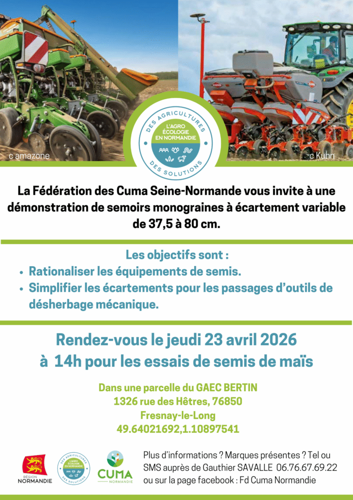 La Fédération des Cuma Seine Normande vous invite à une démonstration technique de semis de maïs ensilage avec des semoirs monograines à écartement variable (Amazone et Kuhn) le :